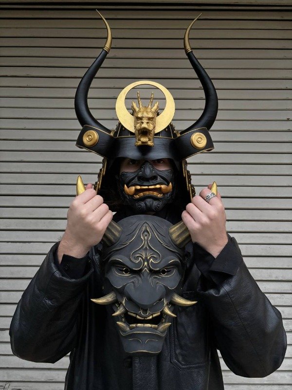 El Kabuto es el casco tradicional del guerrero samurái, una armadura que no solo protegía, sino que transmitía el estatus, el clan y la personalidad del portador. En el modelo ODEN, destacan los cuernos laterales y un imponente emblema frontal de dragón, símbolo de fuerza, liderazgo y protección espiritual. La combinación de negro y dorado resalta su elegancia y poder, mientras que las guardas inferiores unidas con cuerda dorada evocan el estilo ceremonial de los antiguos daimyō.